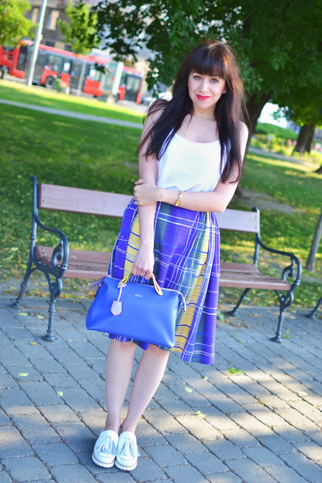 Trošku som odbočila, takže sa ešte vrátim k tej sukni. Keďže je dosť výrazná, obliekala som si k nej jednoduchý biely top na ramienka z rovnako jemného materiálu. A aby to celé pôsobilo i naďalej decentne, obula som si biele mokasíny, ktoré ste si už mohli všimnúť tu. Najviac z celého outfitu ma dostala stredne veľká a tvar pevne držiaca kabelka, ktorej farby mi dokonale zapadli do celkového looku. To bolo vtedy radosti.
