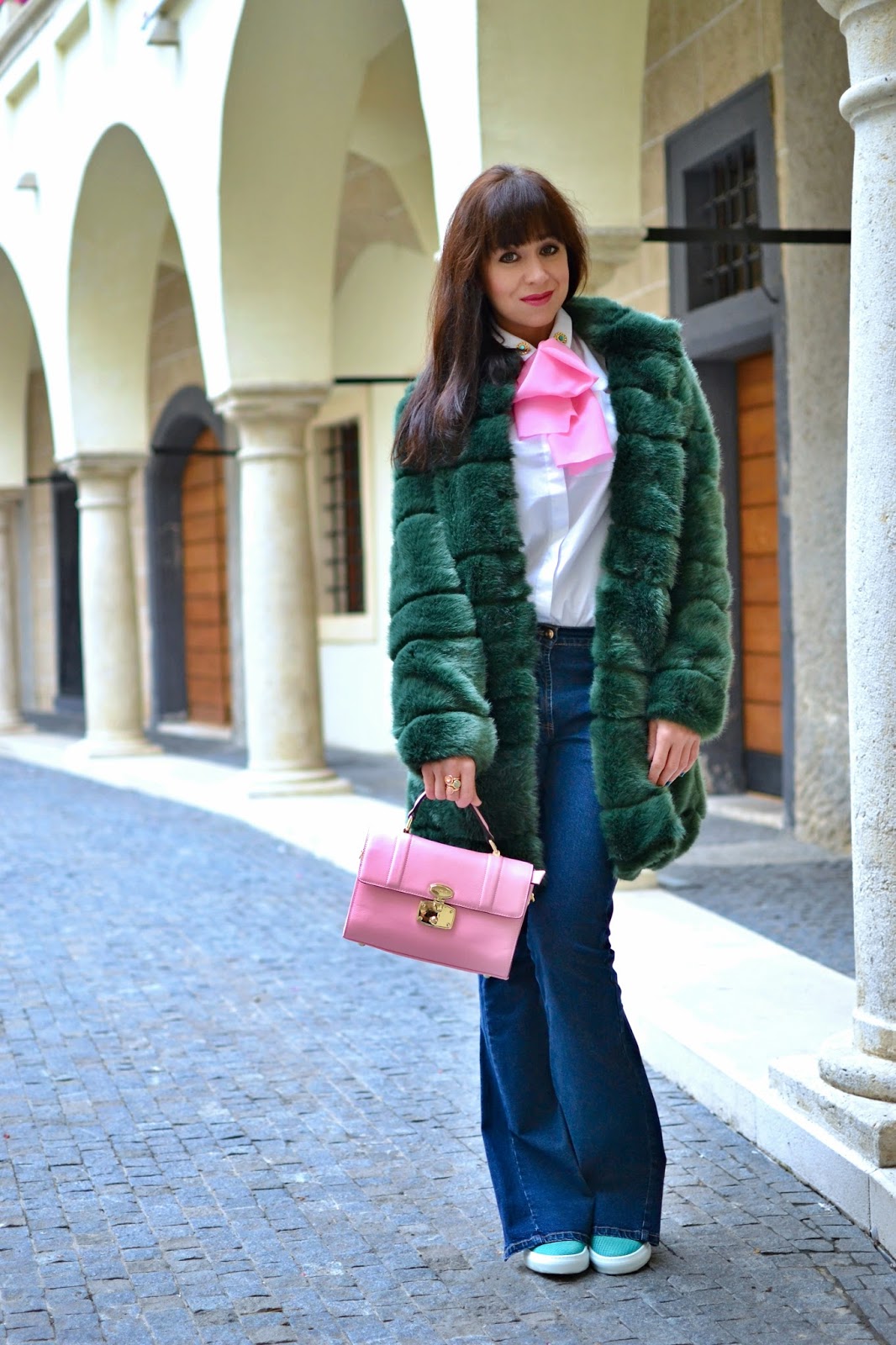 Nakoľko vonku to ešte nie je veľmi „ružové“, stále svoje oblečenie vrstvím. Zvolila som si svoj osmičkový pulóver tmavozelenej farby, ale aby to však v kombinácii s hnedou nebolo príliš smutné, „rozbila“ som to bielou košeľou, ktorú ste videli len nedávno tu. Ani sama neviem, či som si túto košeľu obľúbila pre ňu samotnú alebo len pre tie zlaté gombíky so zeleným kamienkom, ktoré som na ňu prišila. Naozaj veľká dilema, asi skôr to len predsa budú tie gombíky. 🙂 No a zvyšok outfitu tvoria doplnky – tmavozelené čižmy (tie sa často nevidia v uliciach), hnedú kabelku v mojom obľúbenom pevnom tvare a tmavohnedé kožené rukavice, ktoré si ešte sem tam stihnem dať pri tomto striedavom počasí.