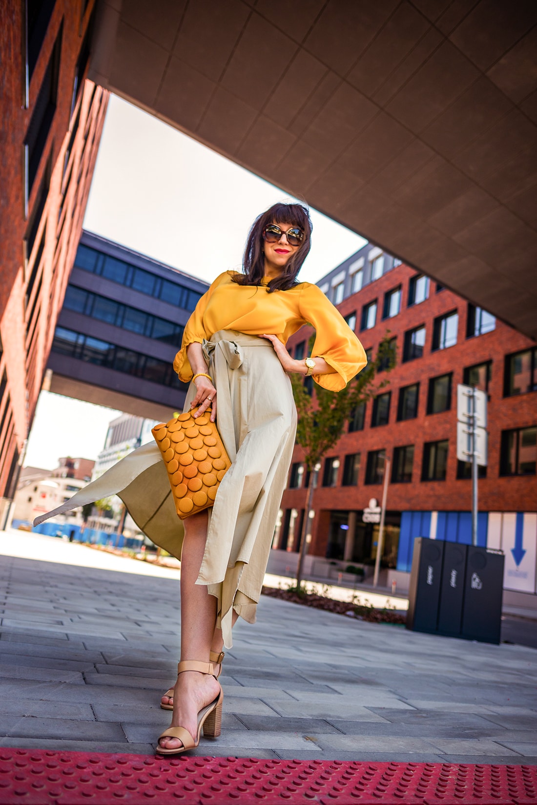 Tak a teraz sa so mnou poďte pozrieť ako sa dá nosiť popelínová maxi sukňa v béžovej farbe a dokonca s obrovskou mašľou. Ja som stavila na žltú blúzku s voľnými rukávmi, ktorú sa mi podarilo farebne zladiť s kabelkou do ruky. Ďalej som sa vyhrala so slnečnými okuliarmi, ktorých tvar tiež ladí s kruhmi na kabelke a to ma veľmi potešilo. Čo hovoríte, tá móda vie byť fakt hravá, že? No a potom už len obuť sa do sandálov, nahodiť nejaký ten náramok na ruku a mohla som vyraziť do ulíc nášho hlavného mesta.